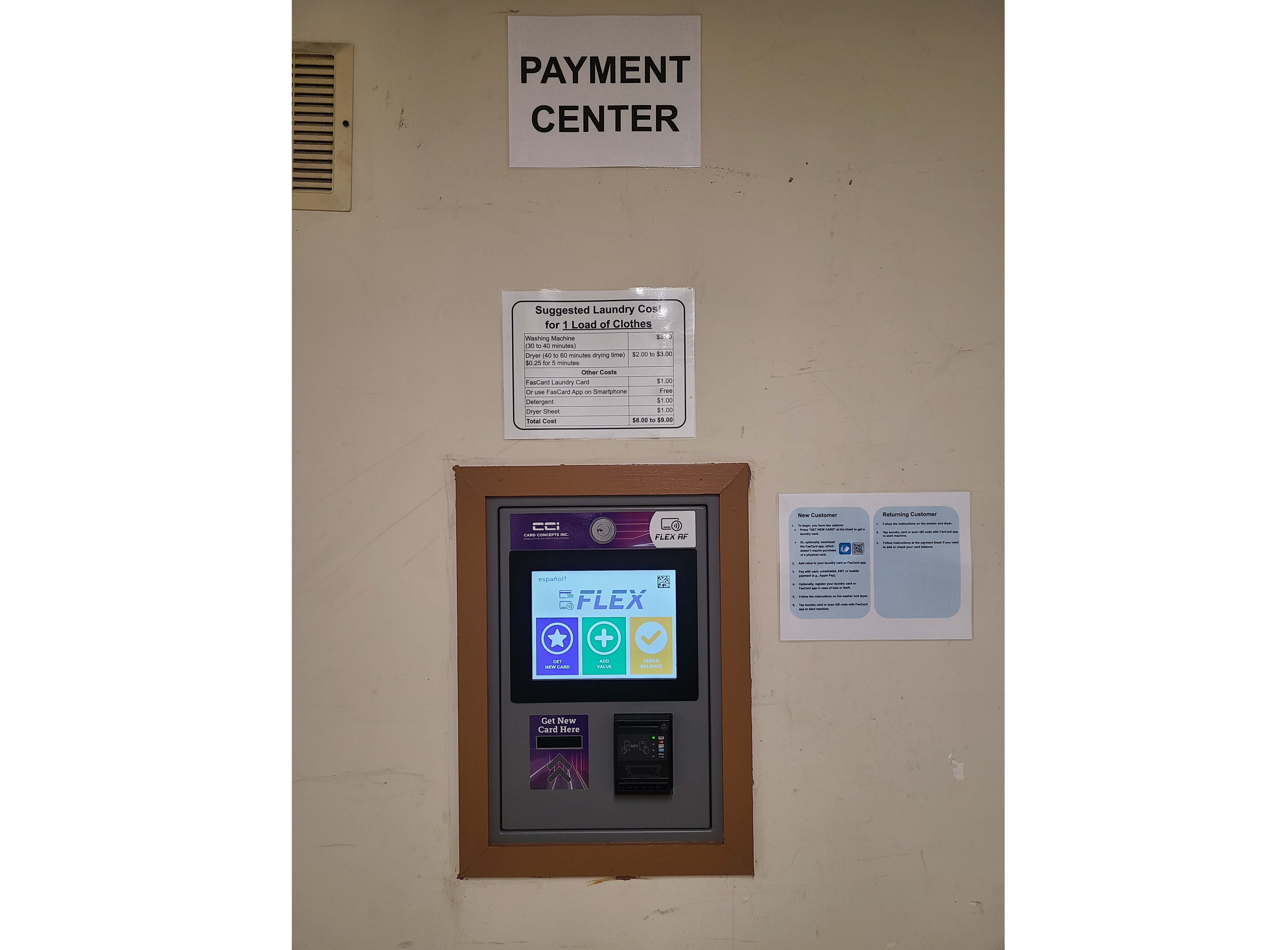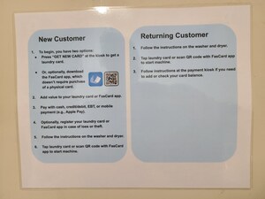 Use FasCard laundry card or phone app to operate washer and dryer. Add balance to laundry card or phone app with cash via on-site kiosk or bank card.