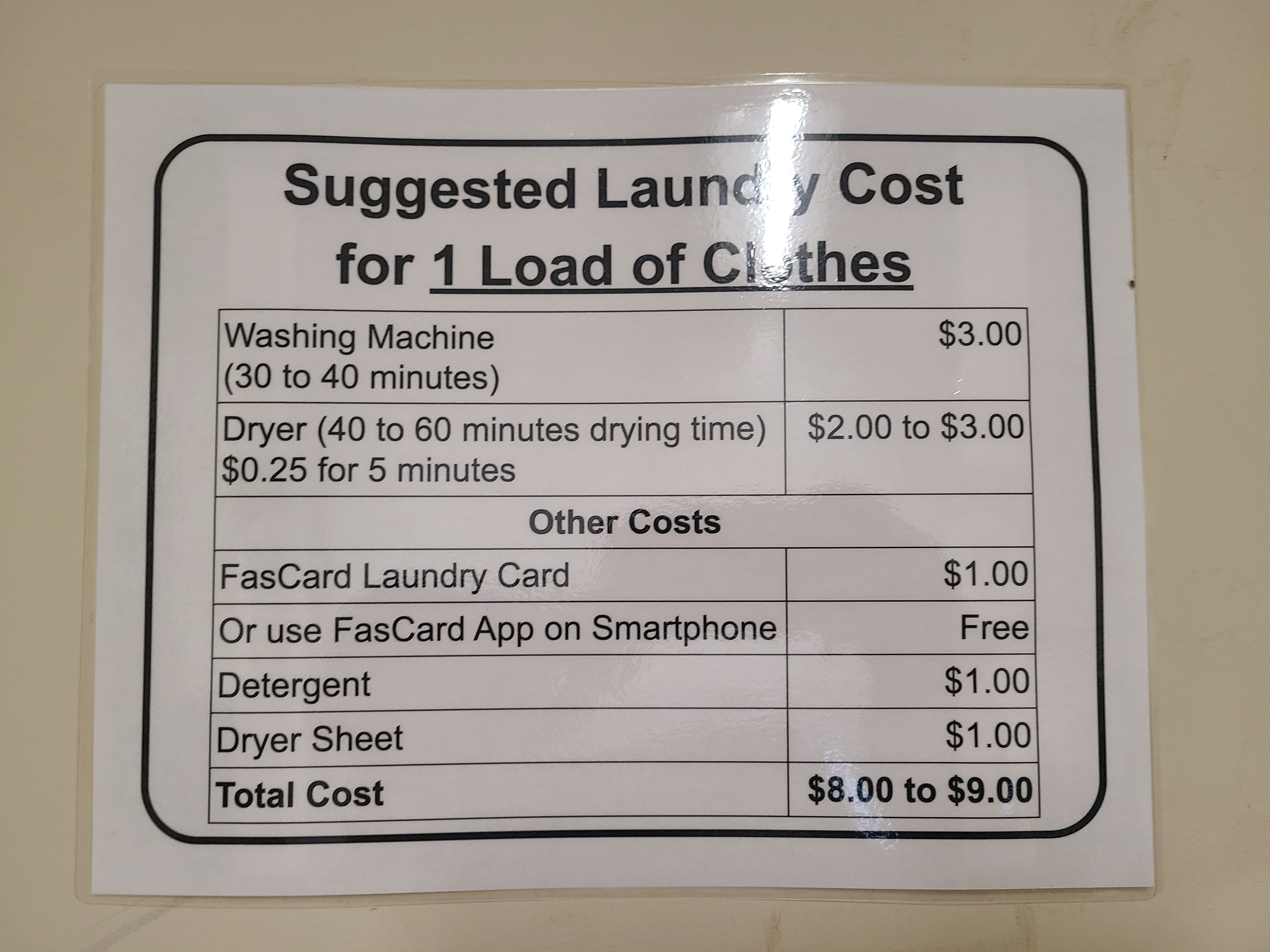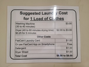 The single load washer is $3 per wash cycle and the double load washer is $6 per wash cycle. The dryer is 5 minutes per 25 cents.